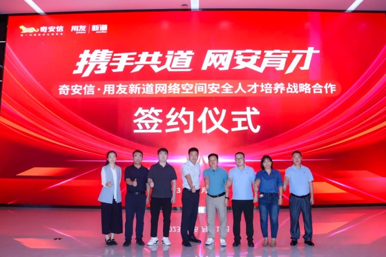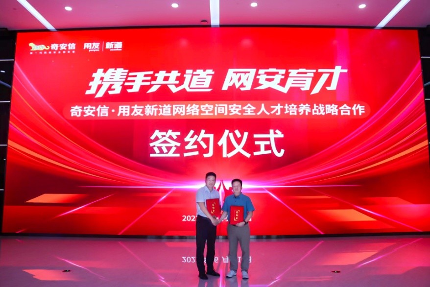 2023年6月21日,奇安信·用友新道网络空间安全人才培养战略合作签约仪式隆重举行,双方达成了“合作共赢、笃行致远”的战略共识,标志着奇安信科技集团股份有限公司与新道科技股份有限公司将共同携手,开启网安人才培育新征程。