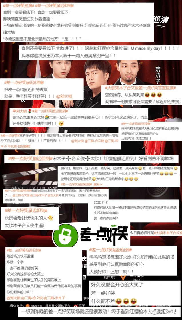 作为特约嘉宾的王祖蓝和张绍刚,此次不仅仅是前来助阵演员,更是海西喜剧前行的定心丸。演出结束后,大锁在社交平台上说到:“欠了大半年的《差一点好笑》北京站终于补上了!新本子排了三天,还好大家喜欢!”并发布了九宫格演出图片与大家分享喜悦。正如他总是挂在嘴边的那句话,“喜剧,永远奔流向前。”从“差一点好笑”到“真的很好笑”,海西喜剧——《差一点好笑》6月即将南下长沙、7月二巡杭州与大家见面,让我们一起相约演出现场,甩掉生活的“紧箍咒”,来一场身心“马杀鸡”!