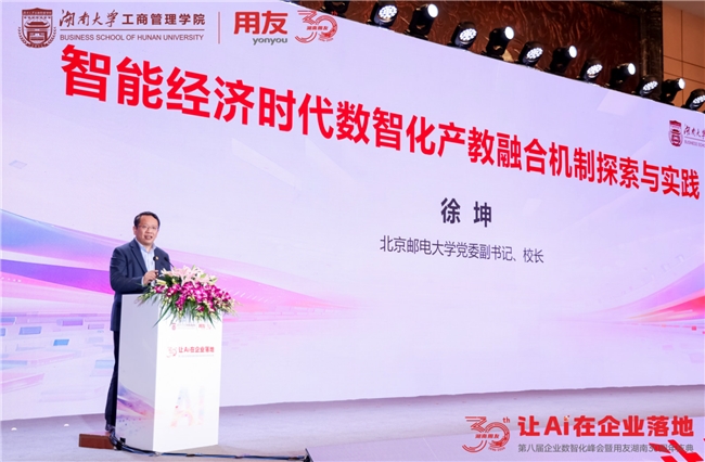 会上,北京邮电大学党委副书记、校长徐坤以《智能经济时代数智化产教融合机制探索与实践》为题,从高等教育与产业发展融合的视角出发,深入探讨了在智能经济时代背景下,如何通过产教融合机制的创新,培养适应数智化转型需求的复合型人才,为企业的高质量发展提供智力支撑。他指出,智能经济时代亟需推动产教融合从“协议式合作”向“内生式共建”转变。他提出以教育智联网为核心,构建“云边端、大中小”模型协同的数智教育公共服务体系,打破教与学、学与用的边界壁垒,实现学校小课堂、社会大课堂与产业真课堂的深度融合。徐坤表示,未来期待与用友及更多企业携手,打造数智化产教融合典型示范,促进资源联动共享,为校企双方在应对未来“不确定性”中提供可预期的“确定性”路径。