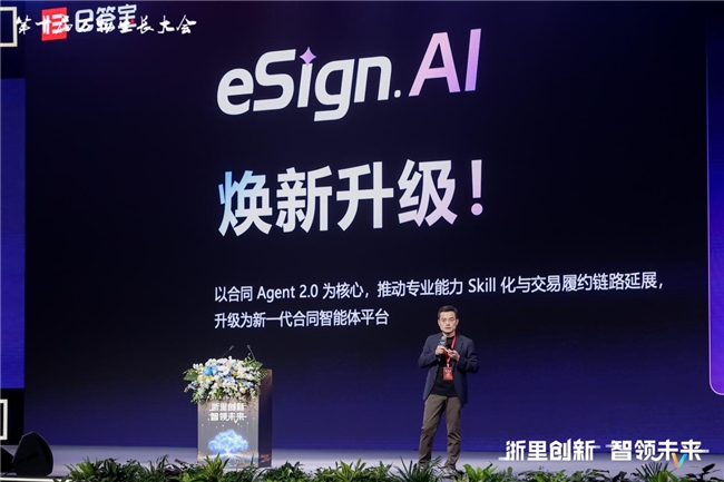 此次大会,e签宝正式官宣全面升级eSign.AI,同步发布合同Agent2.0、VeriAgent.AI等核心产品,以二十年合同能力积淀为根基,完成从传统电子签平台到新一代合同智能体平台的焕新跨越,真正实现“让合同,开始自己工作”。这一升级并非简单的品牌迭代,而是e签宝顺应AI时代趋势,将数字信任能力与AI技术深度融合的战略落地,标志着电子签名行业正式迈入AI原生新时代。