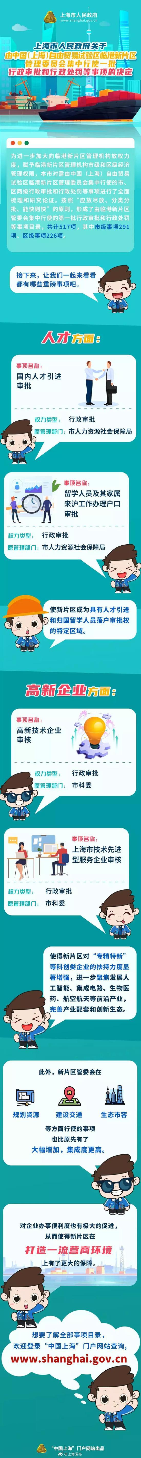 为进一步加大向临港新片区管理机构放权力度,赋予临港新片区管理机构市级和区级经济管理权限,本市对需由中国(上海)自由贸易试验区临港新片区管理委员会集中行使的市、区两级行政审批和行政处罚等事项进行了全面梳理和研究论证。按照“应放尽放、分类分批、能快则快”的原则,形成了由临港新片区管委会集中行使的第一批行政审批和行政处罚等事项目录,共计517项,其中市级事项291项,区级事项226项。包括了人才引进审批、高新技术企业审核等重磅事项。
