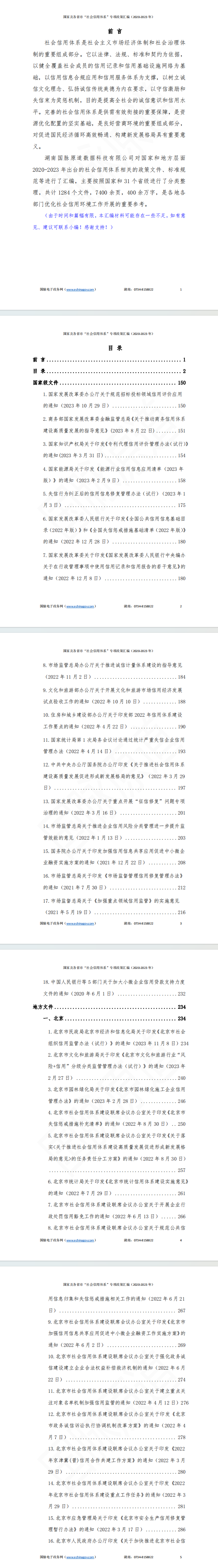 湖南国脉原道数据科技有限公司对国家和地方层面2020-2023年出台的社会信用体系相关的政策文件、标准规范等进行了汇编,主要按照国家和31个省级进行了分类整理,共计1284余个文件,7400余页,近400万字,是各地各部门优化社会信用环境工作开展的重要参考。