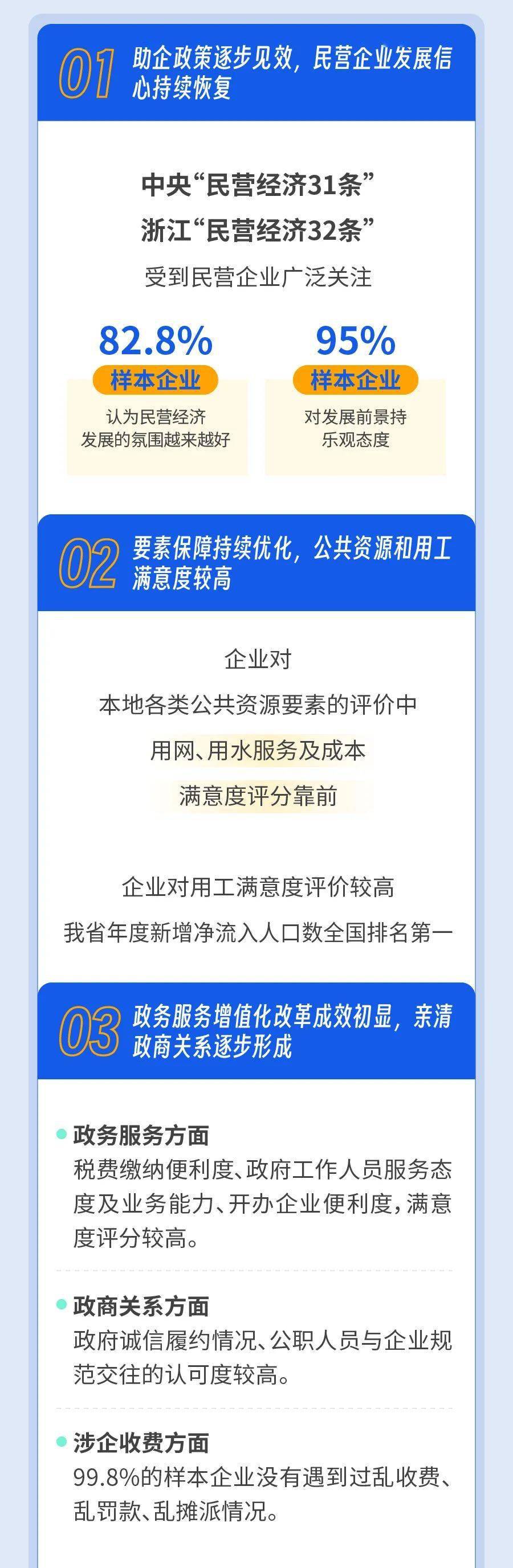 根据全国工商联发布的2023年度“万家民营企业评营商环境”调查结果,我省营商环境满意度位列全国前十,获评营商环境最佳口碑省份,省工商联开展的万家民营企业评营商环境工作案例被评为全国十大优秀实践案例;杭州、宁波位列全国省会及副省级城市前十,并获评营商环境最佳口碑省会及副省级城市,温州、嘉兴、绍兴、金华位列全国地级市前十,温州、金华获评营商环境最佳口碑地级市。