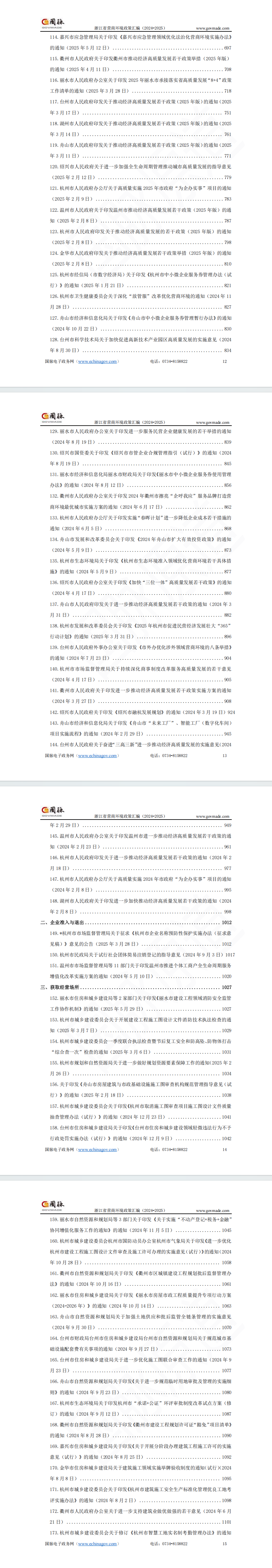 为系统总结、全面展示浙江经验,湖南国脉原道数据科技有限公司对浙江省、市级政府2024—2025年发布的营商环境相关政策文件、标准规范等进行汇编,主要按照企业准入与退出、获取经营场所等12个指标进行分类,共计320个材料,近2000页、150万字,以期为各地各部门优化营商环境工作开展提供重要参考。(备注:由于时间和篇幅有限,仅选取部分代表性政策,如有意见建议可随时联系小编,另此前已发布浙江省2019-2023年政策!)