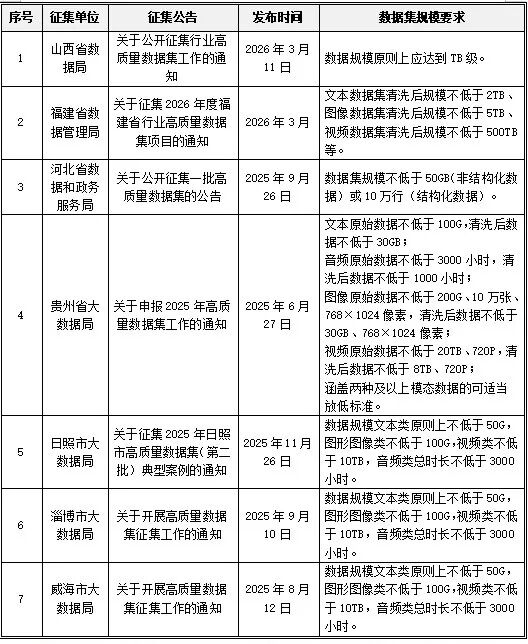 2.规模量级:整体以实用够用、支撑应用为原则,多数地区未设置硬性数据条数或体量门槛,统一强调数据集需达到一定规模与量级,可满足模型训练、算法验证、业务落地等实际使用需求。下表整理了部分明确数据规模地区的要求: