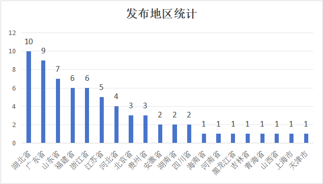 3.从发布地区来看,湖北省、广东省、山东省发布的征集文件数量较多,且三地均从2024年就率先启动征集工作;其次为福建省、浙江省、江苏省等地。总体而言,东部沿海区域征集文件发布最为密集,其发布数量占总数的50%以上,与该区域数字经济发展水平高、数据资源富集、政策推进力度大密切相关。