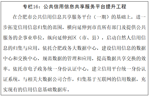 依托全市法人单位资源库和人口信息资源库,推进个人、企业、政府机构及社会组织三大类主体信用信息归集,实现信用信息归集全覆盖,建设全市信用信息基础数据库。加快 “信用合肥”门户网站和“合肥市公共信用信息共享服务平台”建设,实现与市直部门的数据共享交换,实现与国家、省级信用平台的纵向贯通。依托信用信息基础数据库及平台,向公众提供基本信用信息查询服务,为市直部门相关应用提供信用数据,为第三方征信机构提供数据接口。在企业债券发行、环境和资源保护、安全生产管理、食品药品安全和质量管理、政府招标投标管理、财政资金申请等重点领域开展信用信息深度应用。在市场监管和公共服务领域开展联合奖惩应用,推进企业红黑榜的发布和应用。进一步完善信用信息归集和应用相关制度,明确信用主体权益保护、异议处理和侵权责任追究等内容。