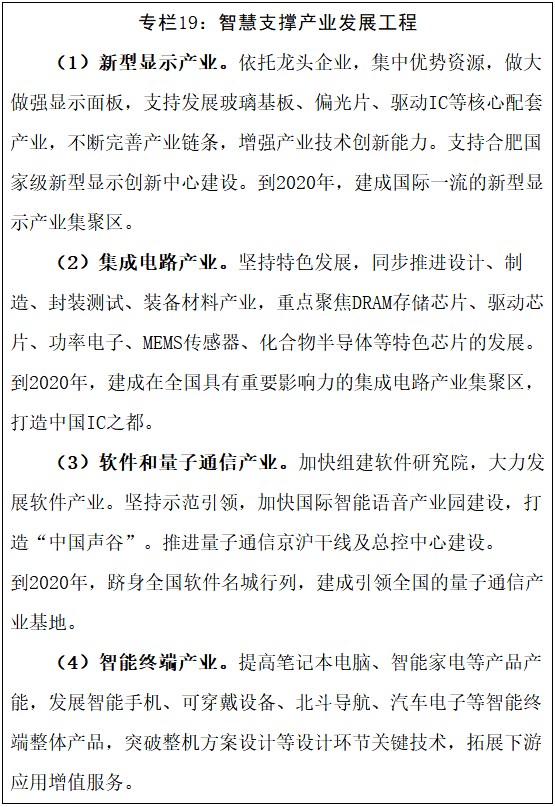 聚焦新型显示、集成电路、软件、智能语音、量子通信、智能终端等重点领域,培育支撑智慧城市建设的新一代信息产业集群。建设高世代液晶面板、高世代玻璃基板、偏光片、光学膜、液晶材料等重大项目,完善产业核心配套,建成国际一流的新型显示产业集聚区。坚持特色发展,同步推进设计、制造、封装测试、装备材料产业发展,加快建设全国具有重要影响力的集成电路产业集聚区。坚持示范引领,推动智能语音的广泛应用。推进量子通信京沪干线等建设,加快建设引领全国的未来网产业基地。积极发展工业控制软件、行业应用软件、信息安全软件、现代信息增值服务等,创建中国软件名城。促进公共安全产业创业创新集群发展,打造具有重要影响力的公共安全应急产业基地。