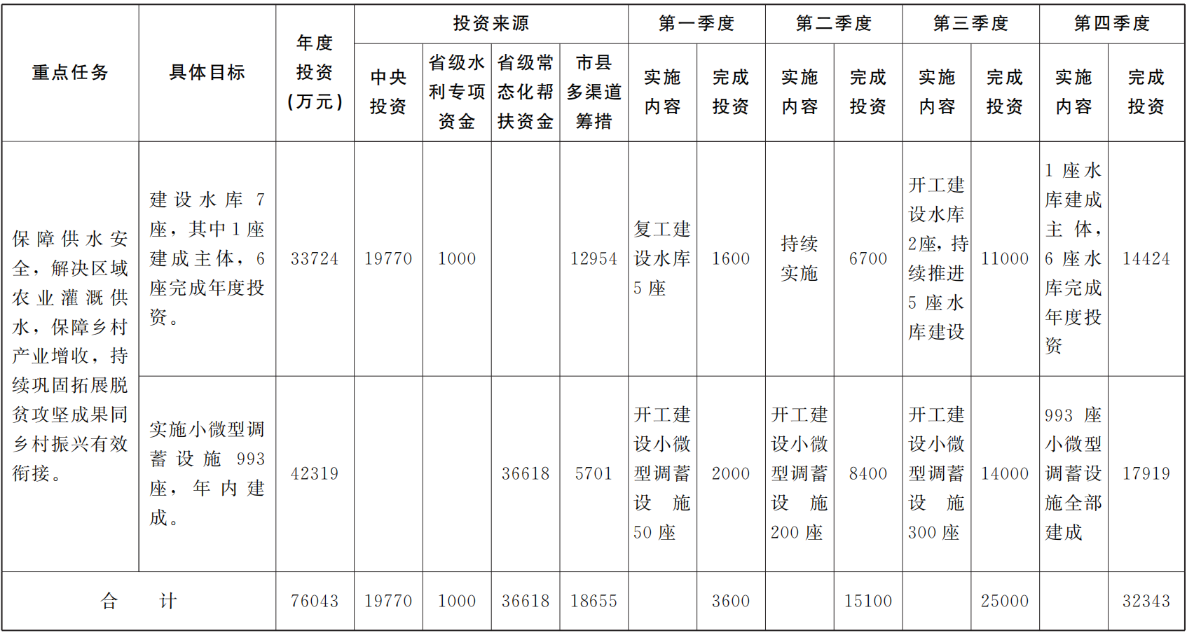 年度估算总投资7.6亿元,其中:拟争取中央投资1.97亿元,省级水利专项资金0.1亿元,省级常态化帮扶资金3.66亿元,市县多渠道筹措1.87亿元。