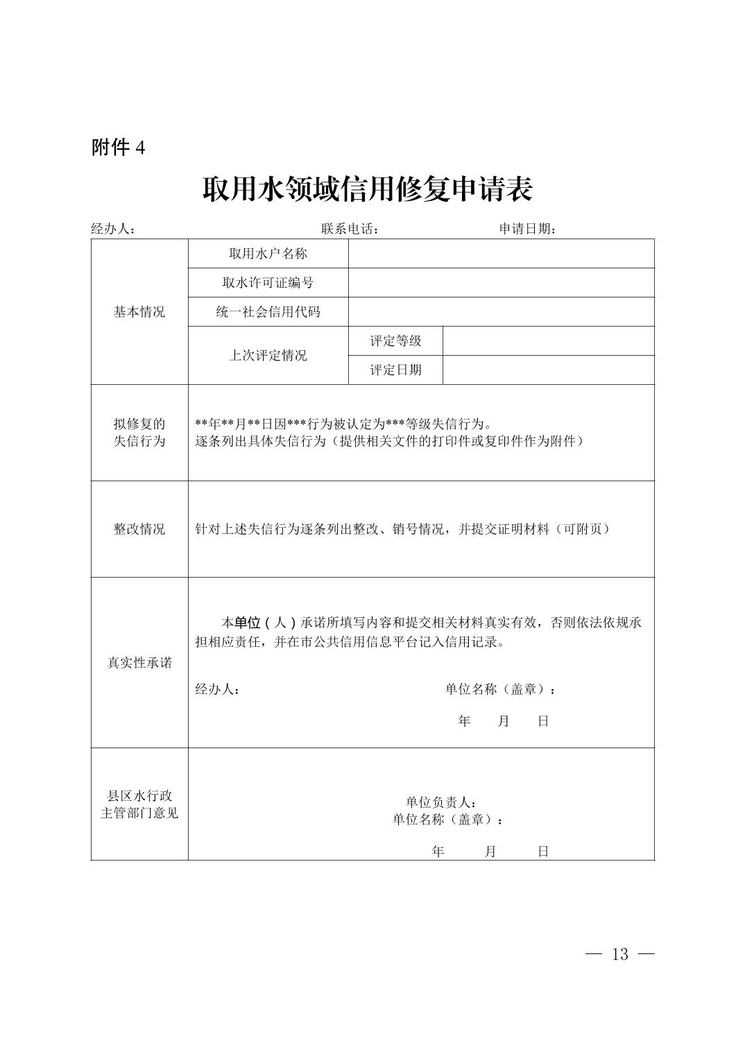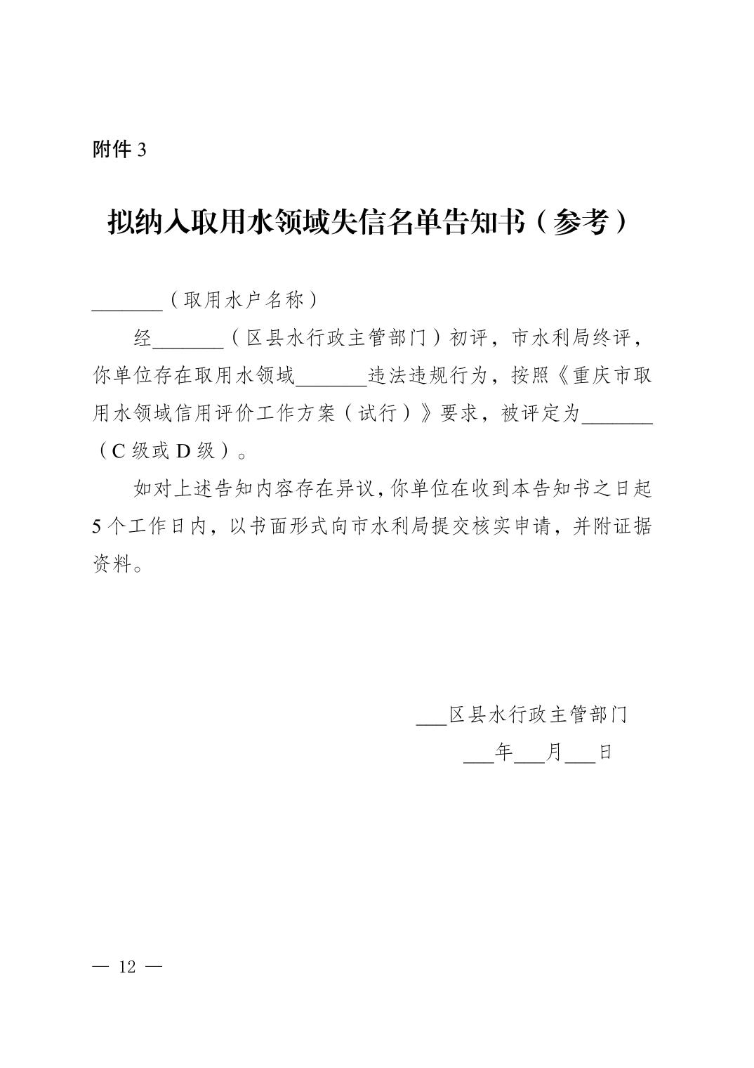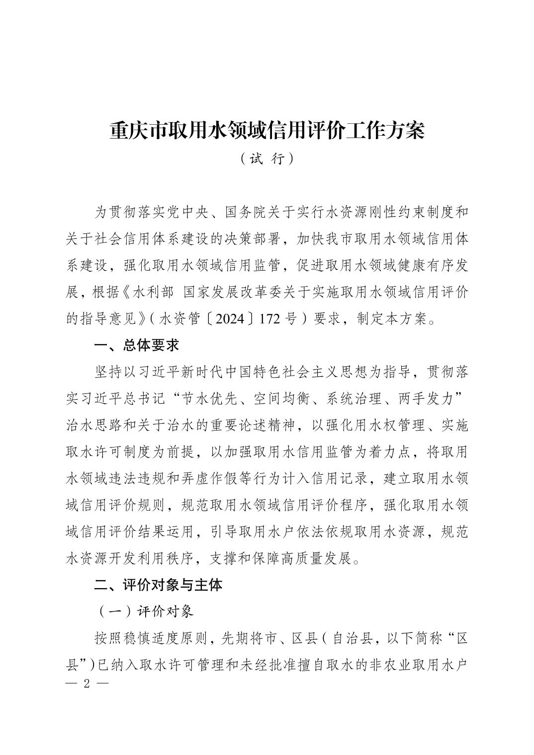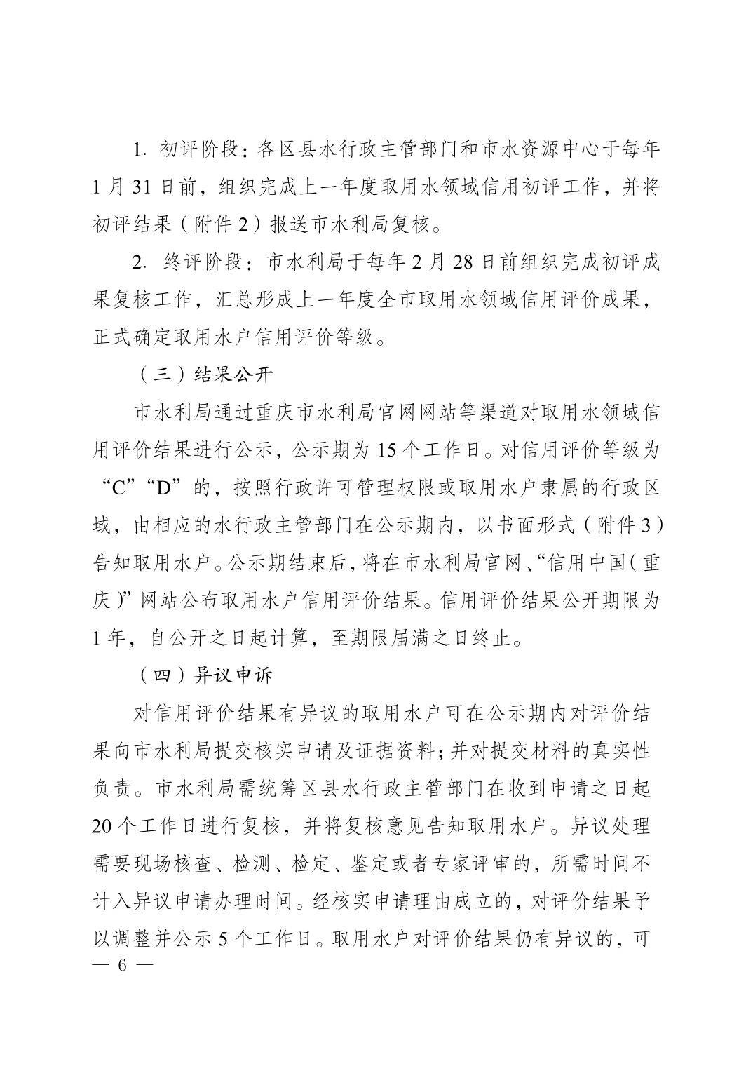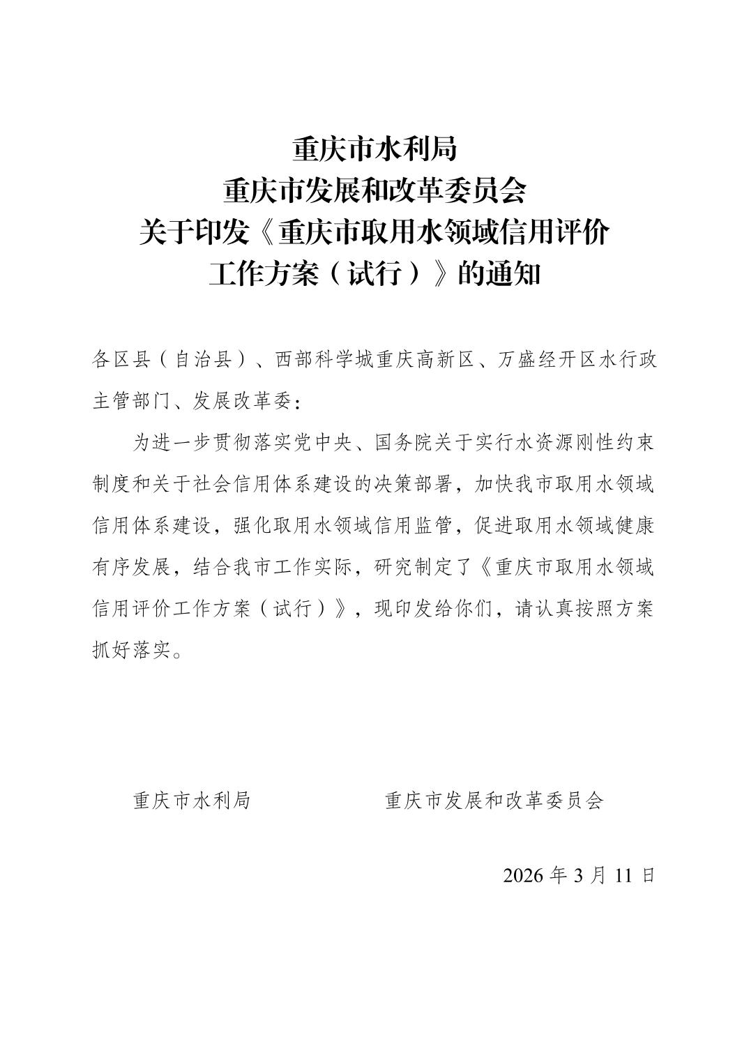 重庆市水利局 重庆市发展和改革委员会关于印发《重庆市取用水领域信用评价工作方案(试行)》的通知 无 分享11 0 全文下载:重庆市水利局 重庆市发展和改革委员会关于印发《重庆市取用水领域信用评价工作方案(试行)》的通知.pdf