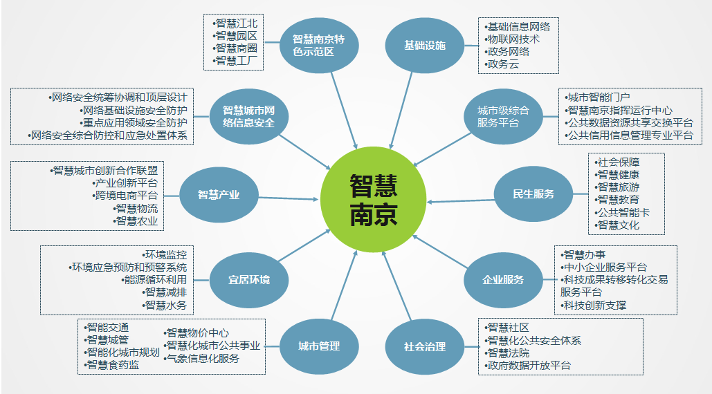 “十三五”期间,智慧南京建设的重点任务涵盖基础设施建设、城市级云服务平台建设、注重民生服务、创新社会治理、突出网络与信息安全、促进生态宜居、做好示范区域的示范工程等方面任务。