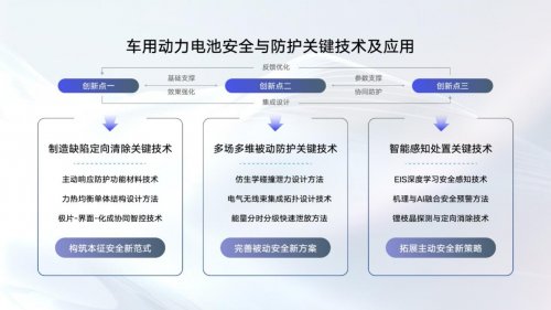 “车用动力电池安全与防护关键技术及应用”项目,通过在本征安全、被动安全、主动安全三个层面,构建“电芯-系统-端云协同诊断”的全方位安全保障体系,实现了“电芯设计好、制造好、系统防护好、整车预警好”的创新突破设计,尽展标杆实力。