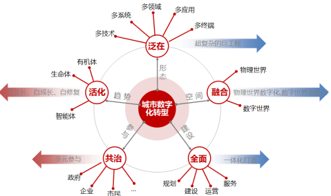 从形态上看,城市数字化转型是一个泛的概念,是一个由多系统、多技术、多领域、多应用、多终端组成的超复杂巨工程。从趋势上来看,城市数字化转型逐渐从机械体向有机体、生命体、智能体进化,能够自生长、自成长、自修复,形成一个共建共治共享的体系。从参与主体来看,多元参与,政府、科技公司、运营商、应用开发商、企业、科研机构、高校、市民等社会各方共同参与,成为规划者、建设者、使用者、运维者和享受者以及优化建议者。从建设过程来看,城市数字化转型是各领域全面推进,包括城市经济发展、民主法治、社会治理、文化发展、生态建设等各领域数字化建设,以及规划、建设、运维、服务的一体化打造。从空间上来看,城市数字化转型是融合创新的,物理世界、数字世界相互融合、共同进步。