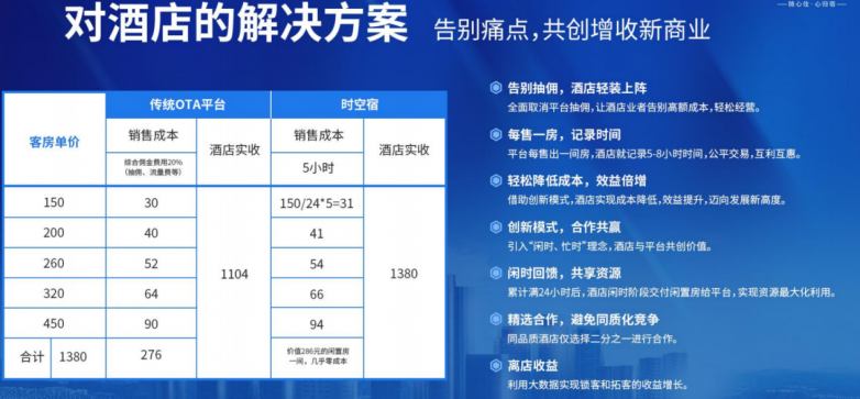 对于酒店,从“支付高佣金”到“0佣金入驻”,酒店无需向平台支付费用,可将部分闲置房间做置换,为酒店降本增效。通过时空宿平台售出的房间,酒店获得100%的房费收入,淡季的空置房可以转化为“时间资产”,合理分配闲置资源,用来吸引平台用户,而且平台只服务于同区域同品质的一半房源,可以更加精准的获得新客源。