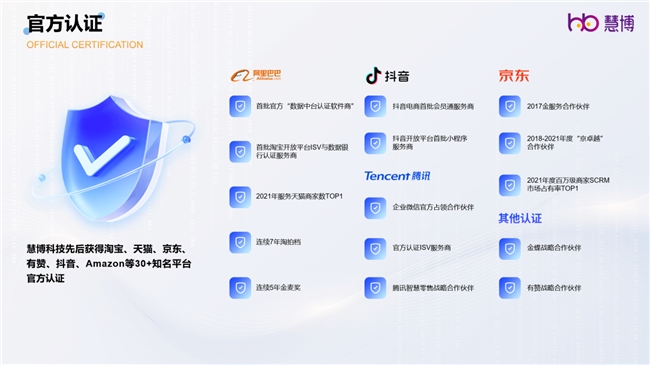 能从众多参赛企业中 “直通” 复赛,并一路闯进决赛,慧博科技的 “底气” 源于 12 年深耕数智运营领域的沉淀。自 2013 年成立以来,公司始终聚焦技术创新,现已构建起覆盖“工具 + 咨询 + 运营” 的全链条数智化服务体系,成为淘宝、京东、抖音等 30 + 主流平台官方认证的 ISV 服务商。