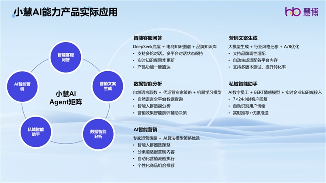 路演中,慧博团队重点展示了小慧 AI 的五大核心能力:智能客服问答(基于大模型 + 电商知识图谱,应答准确率超 90%,支持多平台对话状态同步)、营销文案生成(适配品牌调性,多版本 A/B 测试优化,效率提升 10 倍)、数据智能分析(自然语言取数 + 实时预警,助力商家秒级掌握经营动态)、私域智能助手(7×24 小时情感识别回复,会员复购提升 1X%)、AI 智能营销(自动化人群圈选 + 分渠道策略推送,GMV 增长超 1XX%)。