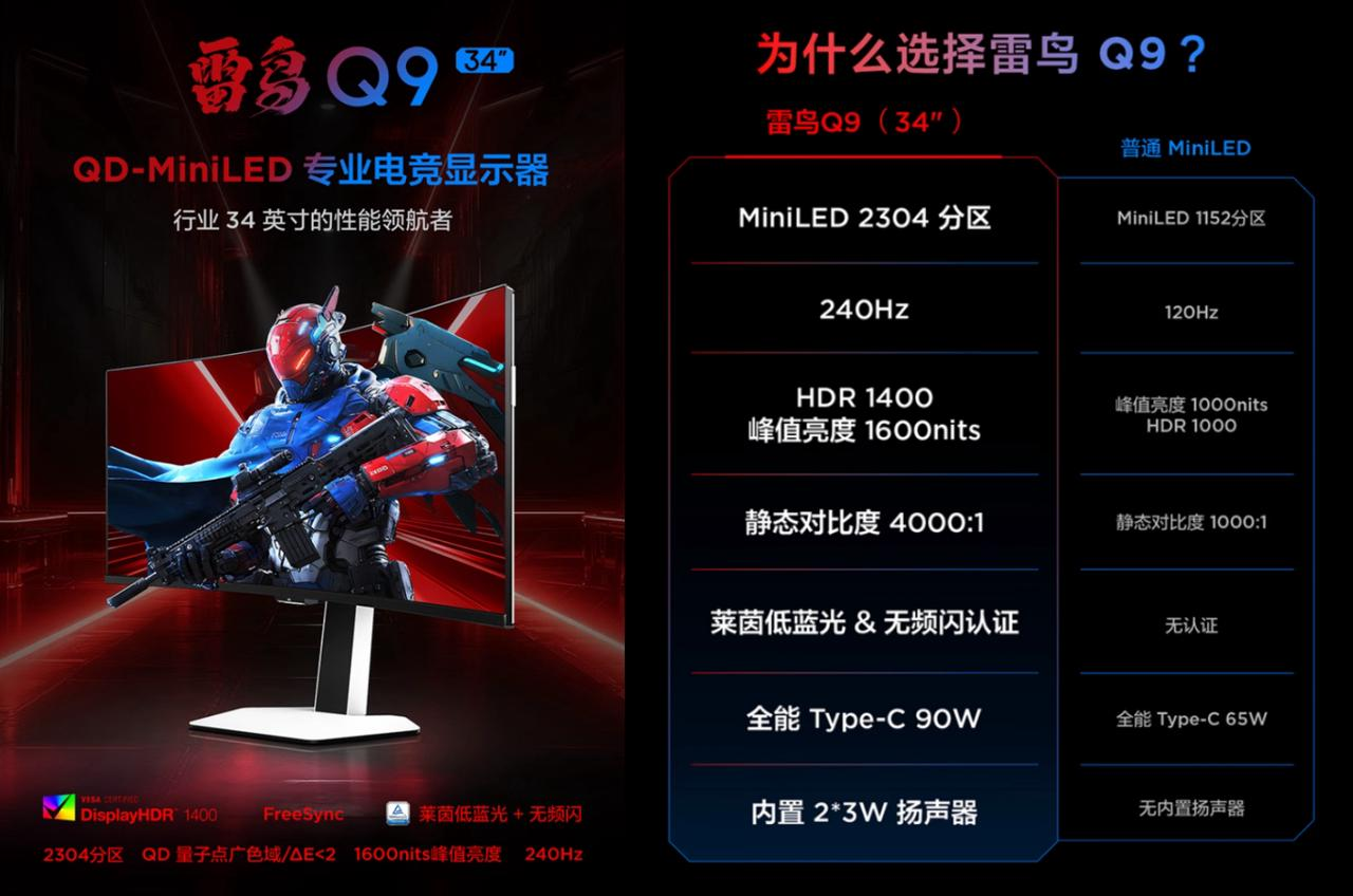 雷鸟34Q9于9月1日正式发布,作为一款34英寸曲面电竞显示器,它凭借多项行业领先参数,为沉浸式电竞体验树立了新标杆。这款显示器采用华星光电新一代HVA面板,结合2304分区独立控光技术,实现了像素级精准光控。相比普通显示器的512分区方案,光控精度提升4倍,黑场亮度降低至0.001nit,光晕控制效果提升65%。在色彩表现方面,雷鸟34Q9支持98% DCI-P3广色域覆盖,并实现ΔE<2的专业级色准,能够高度还原真实色彩。HDR1400认证确保峰值亮度可达1400尼特,结合4000:1的高静态对比度,使画面在明暗过渡中保留丰富细节。