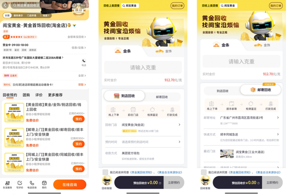 作为美团官方战略合作的黄金回收服务商,阅宝黄金回收服务小程序已在美团平台正式上线。用户通过美团APP即可一键发起服务需求,系统将智能匹配就近服务网点并实时同步订单进度,享受专业、透明、安全的全流程回收体验。