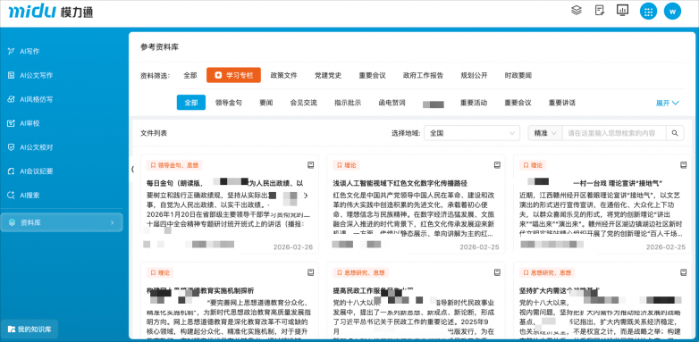 同时,模力通内置的参考资料库、写作范文库涵盖88万+条内容,覆盖政策文件、重要会议、政府工作报告、时政要闻、党建党史等核心大类,包含重要讲话、领导金句、指示批示、重要活动等专项内容。素材均源自官方平台、地方政府网站及三大央媒等权威发布渠道,支持快速检索与一键引用,契合机关事业单位的公文写作需求。