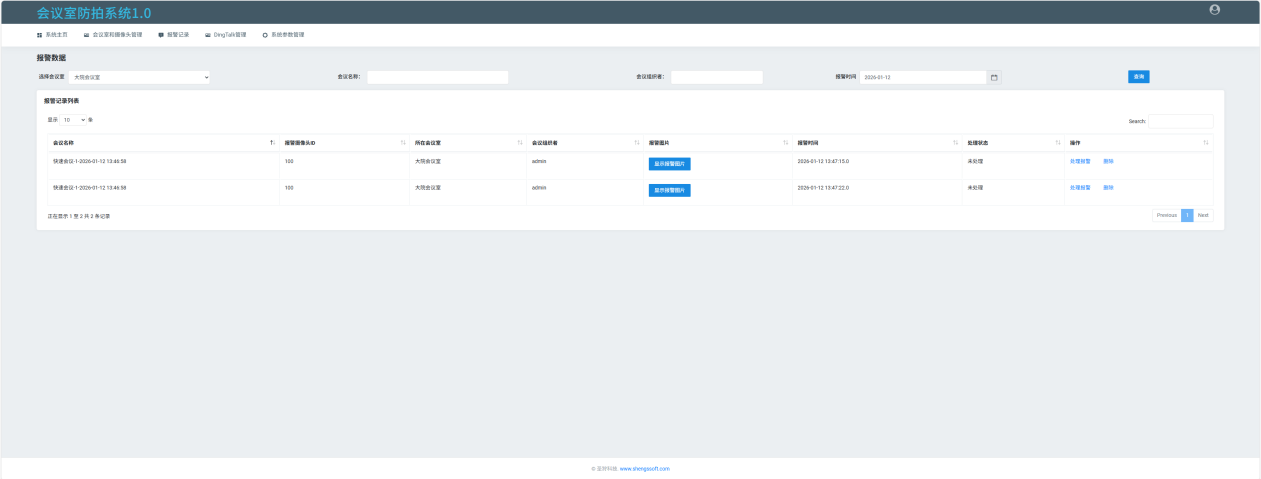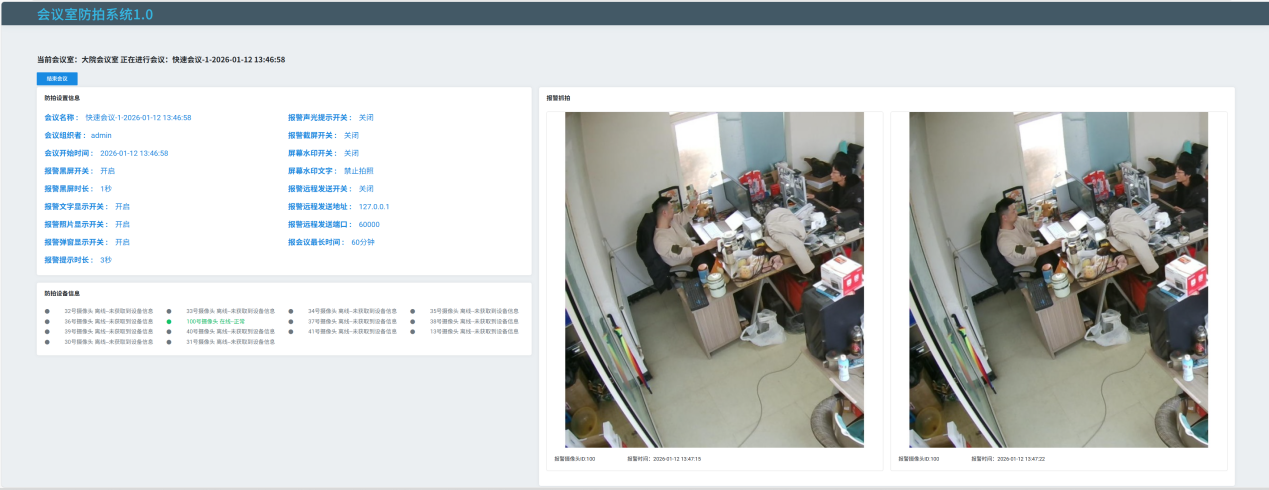 系统配备专业取证追溯功能,触发报警的瞬间,自动同步记录全维度证据信息,包括精准报警时间、会议室编号、窃照具体位置、拍摄者清晰照片及现场视频片段等关键内容。所有证据均安全存储于系统数据库,具备防篡改、防删除特性,管理人员可通过管理平台随时查询、调取;若发生信息泄露纠纷,这些完整的证据链能为企业提供强有力的法律依据,快速明确责任主体,助力企业在会议室防拍照、空间防拍照及涉密空间防拍的维权场景中维护合法权益。