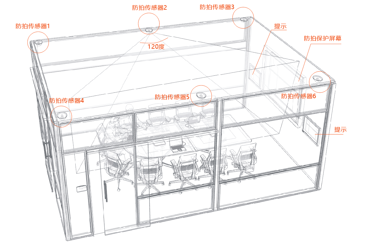 系统搭载高精度传感器 + 先进图像识别与动作捕捉技术,专门针对手机、平板等日常便携拍摄设备研发,可快速识别各类疑似拍摄操作,为会议室防拍照、空间防拍照筑牢第一道识别防线。传感器拥有 120° 扇形探测范围,3 米探测距离全面覆盖会议室屏幕前方核心区域,近距离偷拍、远距离抓拍都能精准捕捉,光线亮度>100lumen 时识别率超 90%,全方位无死角监测,让任何窃照行为都无处隐藏,从源头发现涉密空间防拍的泄密隐患。