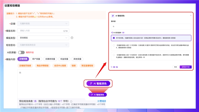基于商家输入的基础短信内容进行 AI 智能优化,自动融入店铺类目、品牌信息等专属内容,让文案更贴合品牌调性,告别千篇一律的模板化表达。