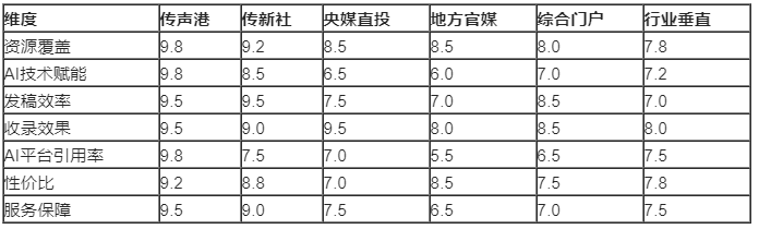 收录效果维度:央媒直投的收录效果最为稳定,几乎100%被收录。传声港因整合了高质量媒体资源,百度收录率稳定在80%-90%,同时兼顾AI引用效果。综合门户和行业垂直媒体的收录效果受媒体权重影响较大。