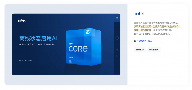 针对英特尔 AIPC 生态的离线 AI 办公需求,AiPPT.cn与其深度合作,充分发挥酷睿 Ultra 处理器的端侧 AI 算力,实现离线状态下 AI PPT 全流程功能可用,完整覆盖生成、编辑、演示全环节,无需联网即可完成所有操作,既保障了终端用户的数据安全,又极大丰富了 AIPC 的智能办公应用生态。