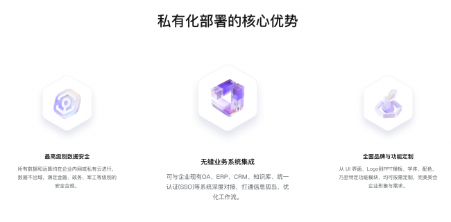 针对企业最核心的数据安全与合规需求,AiPPT.cn私有化部署实现所有数据存储、AI 运算、内容传输全流程在企业内网或私有云内闭环完成,数据全程不出域、不触公网,从根源上杜绝数据泄露、篡改的风险,完全满足金融、政务、军工等强监管行业的最高安全合规标准。
