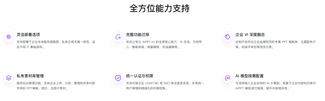 AiPPT.cn私有化部署方案,以企业核心需求为原点,以五大核心能力为支撑,一站式解决企业 AI PPT 落地的所有痛点,完整匹配企业从安全合规到业务适配的全部核心诉求。