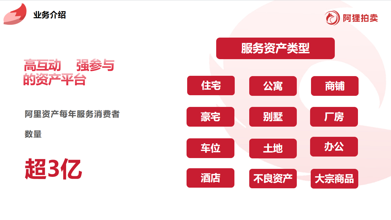 - 产品介绍:聚焦急售、高性价比商业资产,通过线上竞拍模式为业主提供快速通道,同时为投资人筛选优质标的。