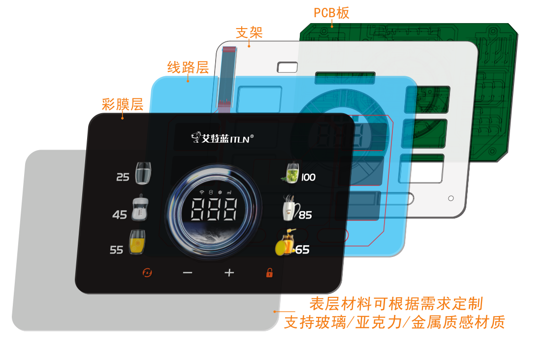 - 综合特性:具备高印刷精度(可达±0.05mm)、多层复合结构(PET/PC/亚克力基材)、抗指纹/防眩光处理、可集成背光或电容触控功能。