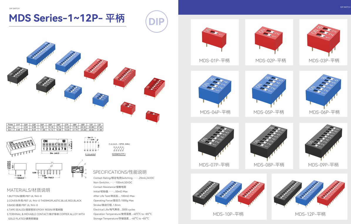 - 产品体系:涵盖DS平拨直插、DP琴键式(侧拨)直插、DA平拨弯脚、DI/DM直插及贴片系列,支持2–12位多种组合。